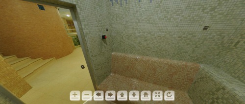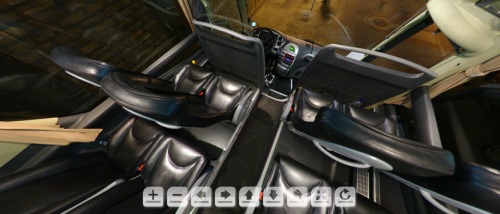 Scania busz belsejének, utasterének panoráma fotója a vezetőülés közeléből.